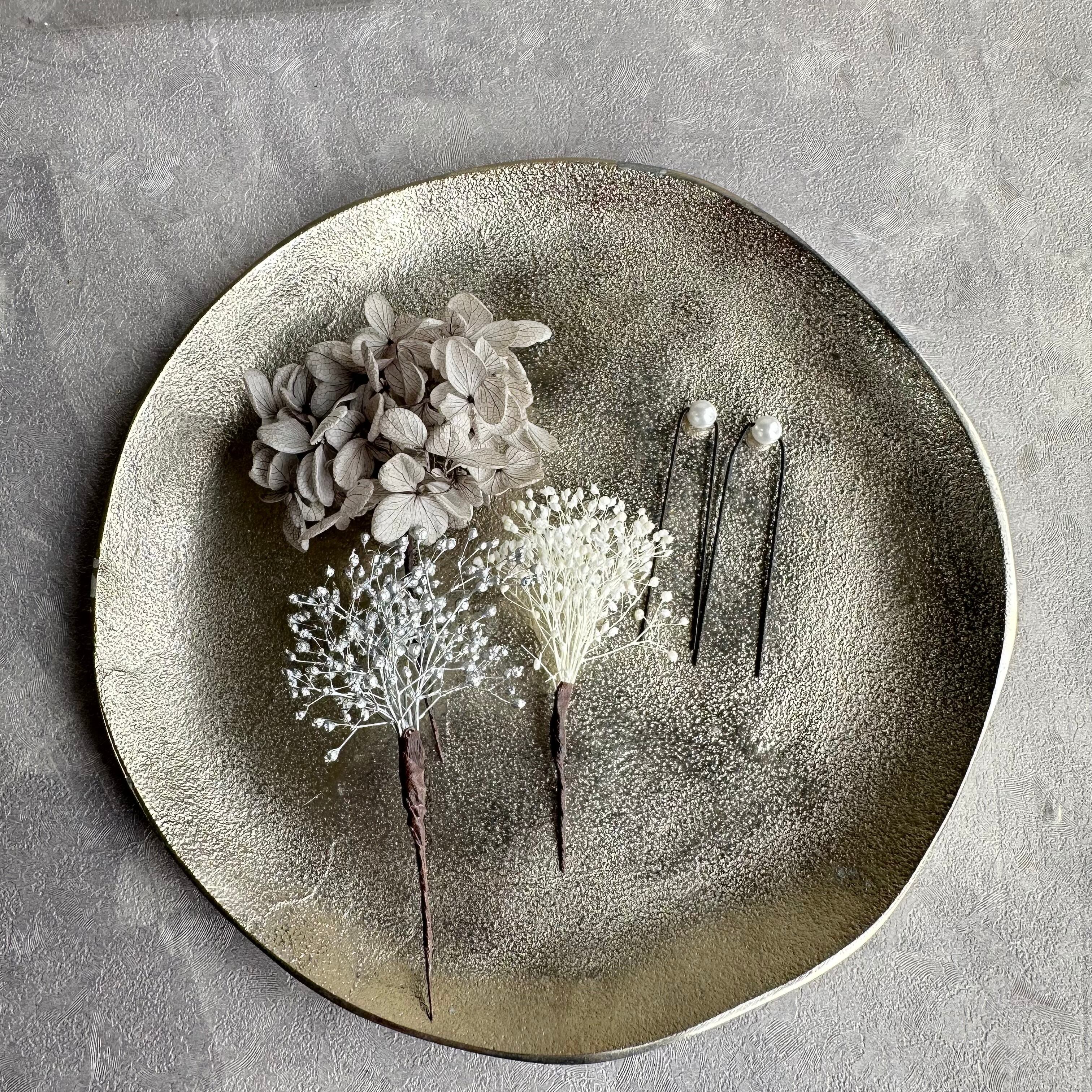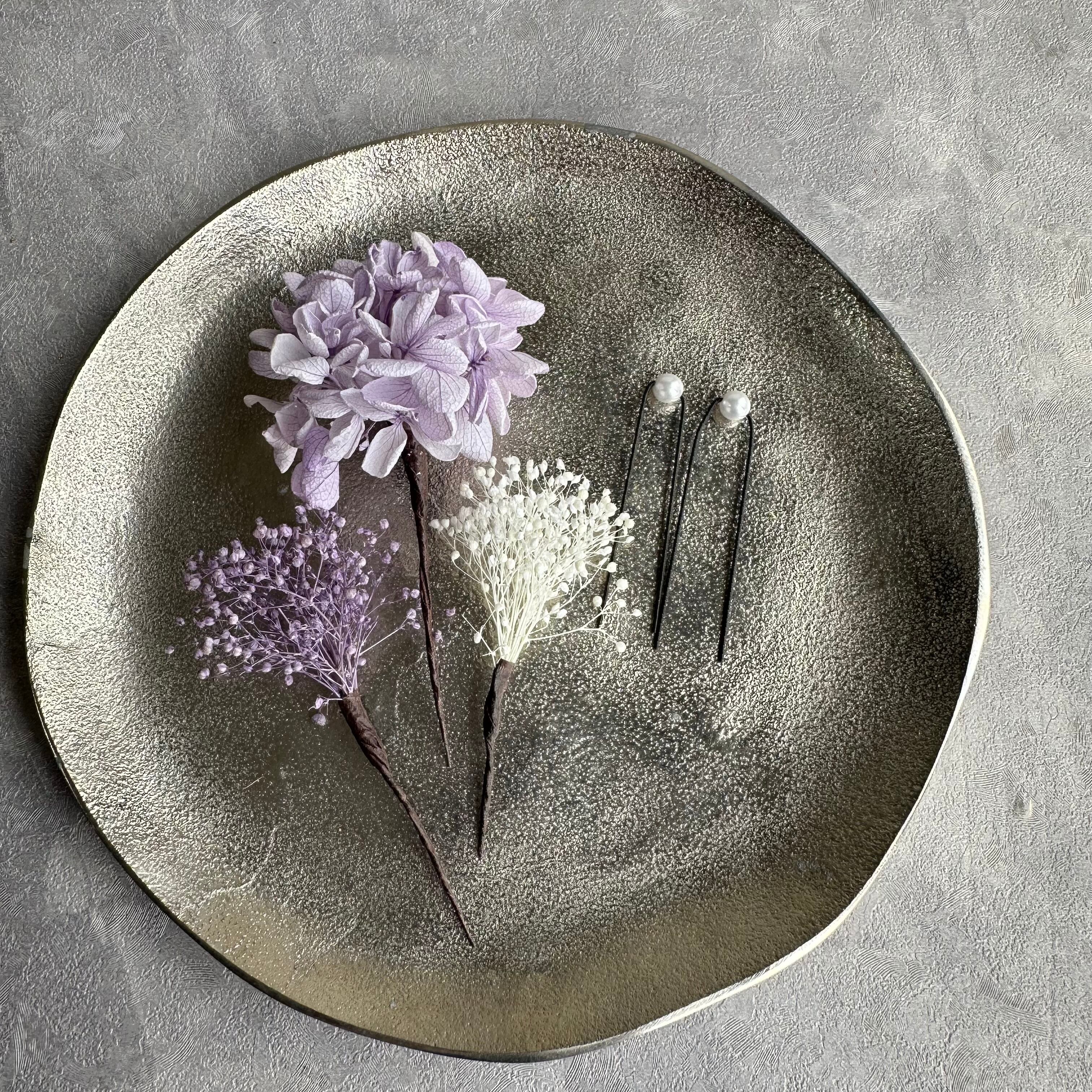 紫陽花とかすみ草、パールの髪飾りセットです。